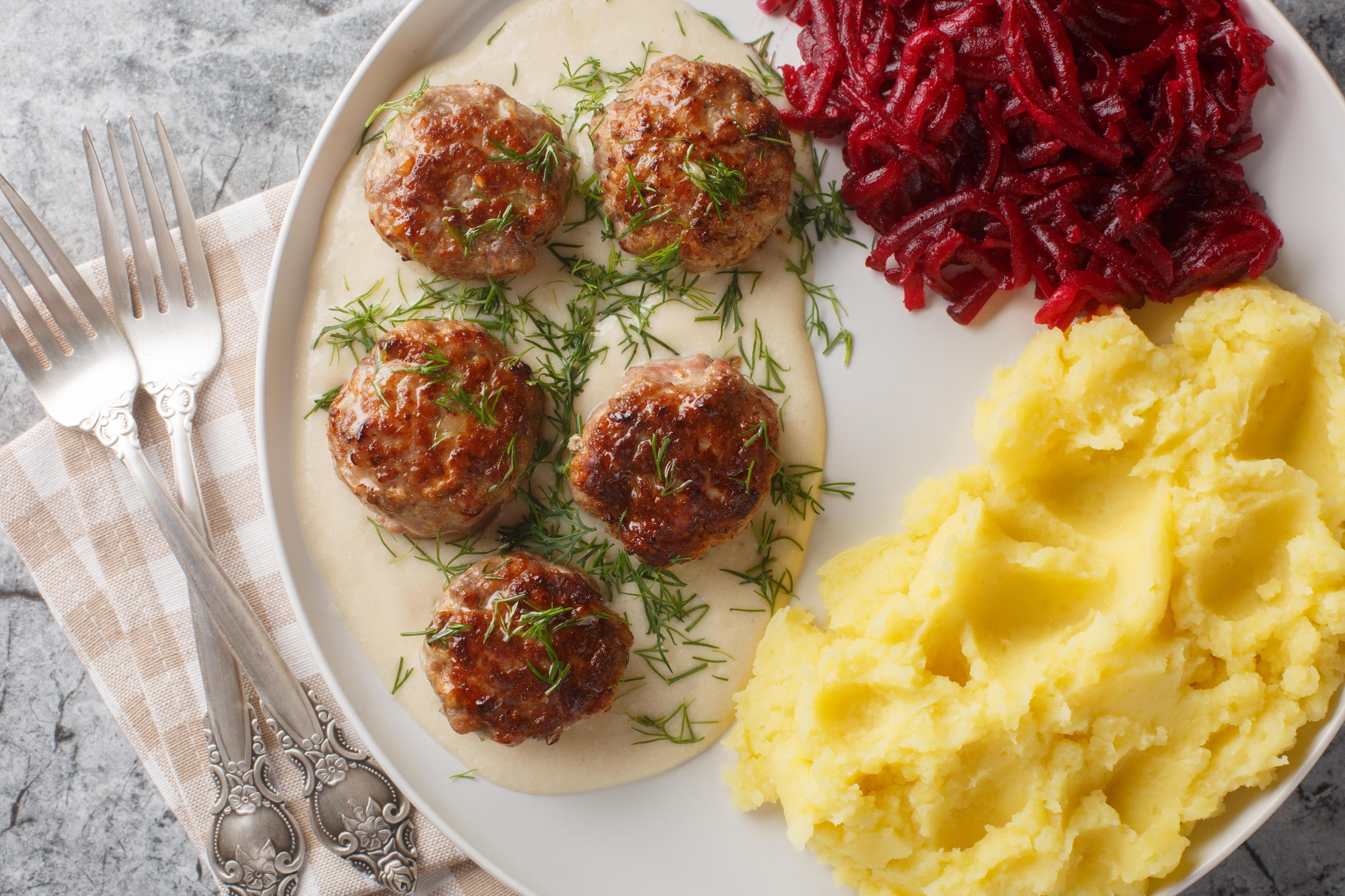 Еще один вариант мясного блюда в детском саду — куриные кнели. Их делают из куриного филе и риса. На килограмм фарша идет 0,5 стакана отваренного и остывшего риса. Лук и яйца тоже не добавляют. Сформированные шарики запекают в духовке. Подают с отварной свеклой, измельченной на терке и сбрызнутой растительным маслом. Как вариант — с другим овощным салатом, например, свежей или квашеной капустой.