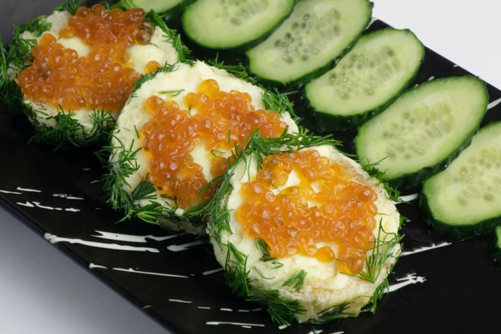 Диетический вариант для тех, кто не ест изделия из муки, и кому вариант с крекерами и хлебом не подходит. Свежий огурец нужно нарезать по диагонали так, чтобы толщина среза была примерно 0,5-0,8 см, обсушить салфеткой, чтобы убрать влагу и ложкой аккуратно снять сверху немного мякоти. Получится углубление, куда выкладывается соус (густая сметана, мелко порубленный укроп, черный перец — по вкусу), а сверху — красная икра. На тарелке такие бутерброды из огурца можно чередовать с нарезкой или канапе из лосося.