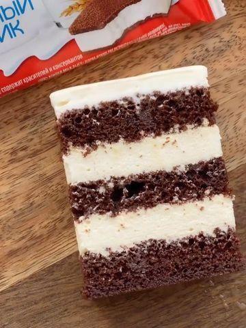 Подходящую по размеру форму застелите пищевой пленкой, выложите на пленку половину шоколадного коржа. Распределите сливочную начинку по коржу. Сверху накройте второй половиной коржа. Накройте пищевой пленкой и отправьте в холодильник на 30-60 минут. При подаче аккуратно уберите пищевую пленку.