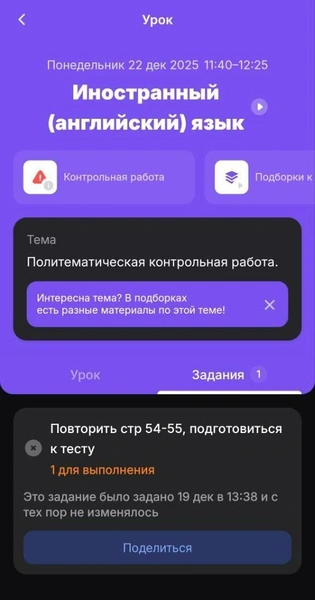 В расписании выберите текущую дату и нажмите на строку с нужным предметом. Перед вами откроется страница с предметом, на которой вы увидите две вкладки: «Урок» и «Задания». Во вкладке «Урок» показана пройденная сегодня тема, во вкладке «Задания» — домашнее задание. Кликните на нее.