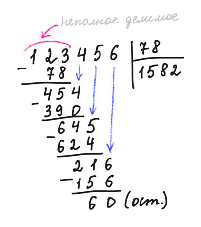 Представим, что делимое — это цифры в очереди. Смотрим, если первая цифра делится на делитель (даже с остатком), то берем ее. В нашем случае 1 не делится на 78, поэтому берем две цифры. 12 не делится на 78, двигаемся дальше по нашей очереди. 123 содержит в себе один раз 78, поэтому в частное пишем 1, вычитаем 78 и получаем остаток 45. Сносить мы можем по одной цифре, поэтому сносим следующую цифру в очереди. В 454 содержится 5 раз число 78, вычитаем 390, остаток 64, сносим следующую цифру в очереди.