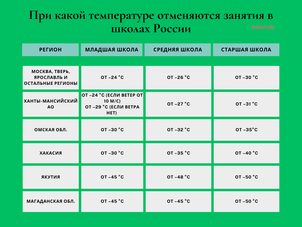 Хуже всего морозы переносят маленькие дети, поэтому уже начиная от –25 °C отменяются занятия для учеников младшей школы. Дети постарше справляются лучше, поэтому для учеников 5-9-х классов средняя температура для отмены занятий — от −26 °C, а для старшей школы (10-11 классы) — от −30 °C.