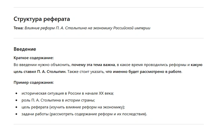 «Напиши структуру реферата на тему [название]. План должен включать в себя введение, основную часть и заключение с названиями подглав и их кратким содержанием. Дай список источников, к которым можно обратиться по теме».