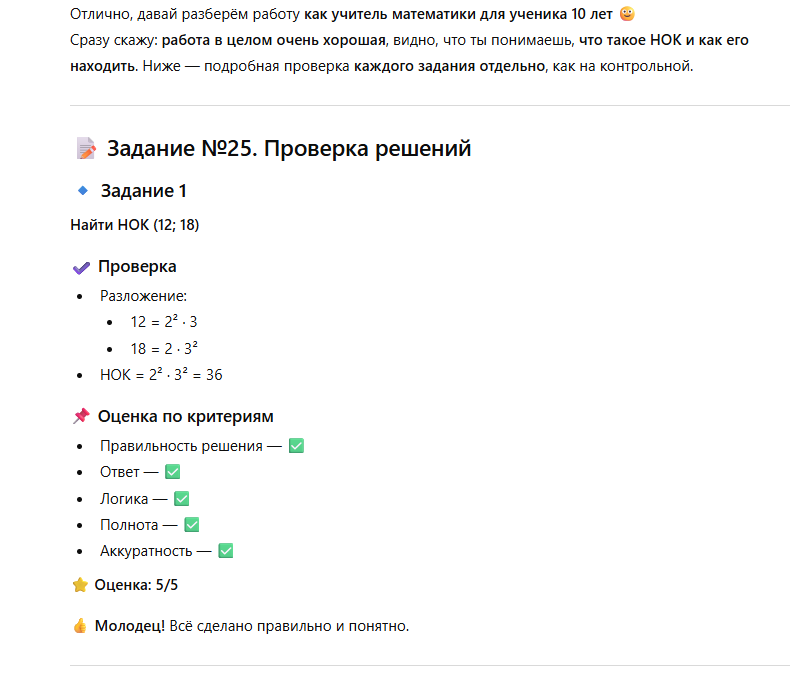 «Представь, что ты — учитель по [предмет]. Я пришлю тебе задания и ответы на него. Проверь каждое задание по следующим критериям: правительность решения, ответ, аккуратность, соответствие требованиям, логика рассуждения и полнота ответа.