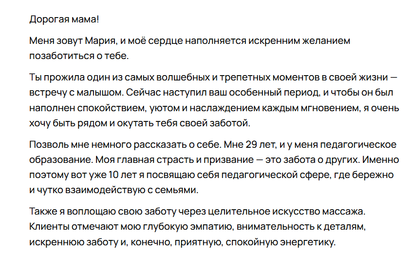 «Очень приятно было общаться, поддержала беседу и с пониманием отнеслась на темы касающиеся декрета. Буду ещё обращаться к ней за услугами! Сто тысяч спасибо!».