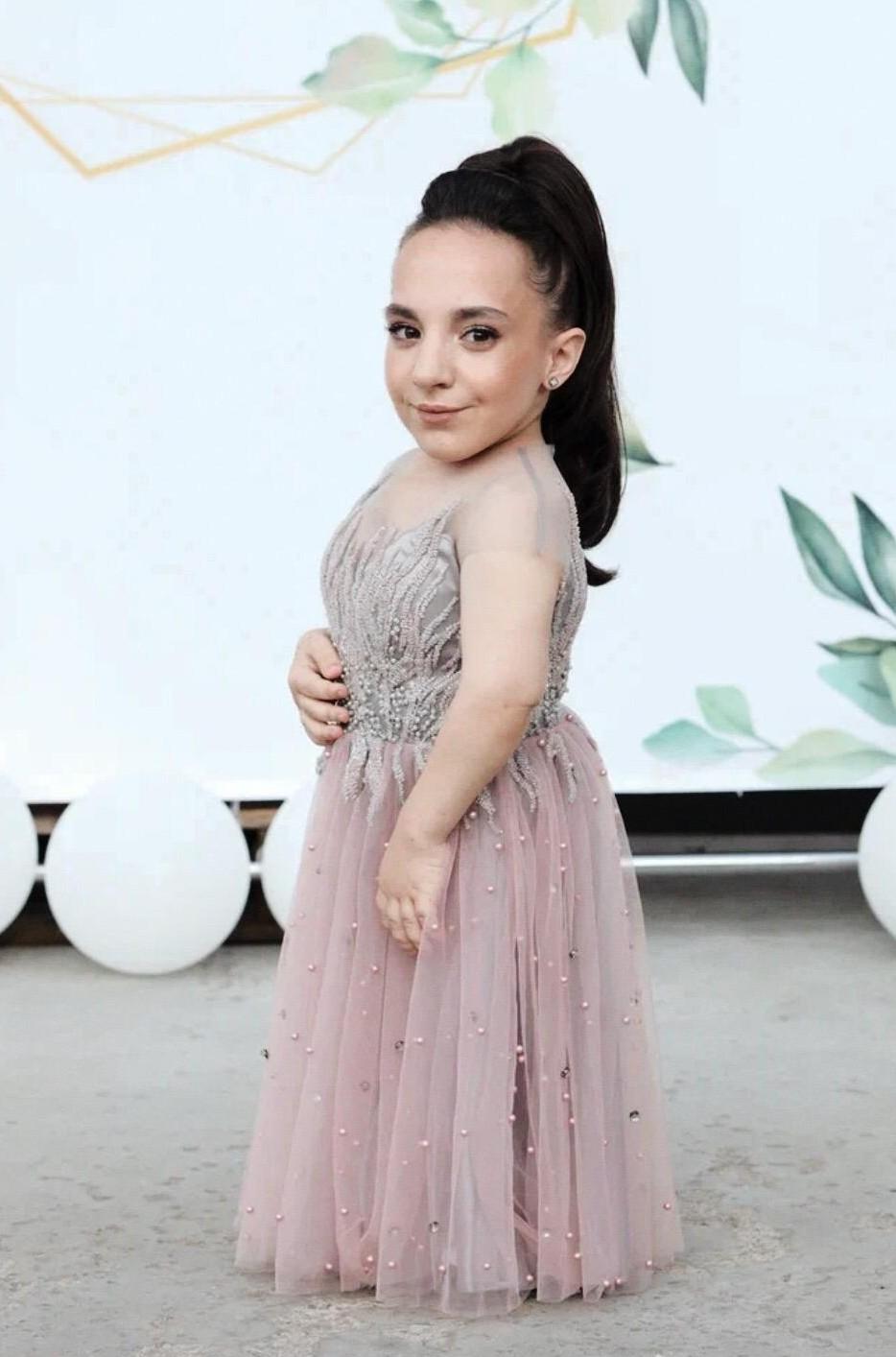 Из-за невысокого роста Полине приходится покупать одежду и обувь в магазине детской одежды, но и иногда ее все равно приходится перешивать, ведь ее рост соответствует росту двухлетнего ребенка. А вот платье на выпускной пришлось шить на заказ.