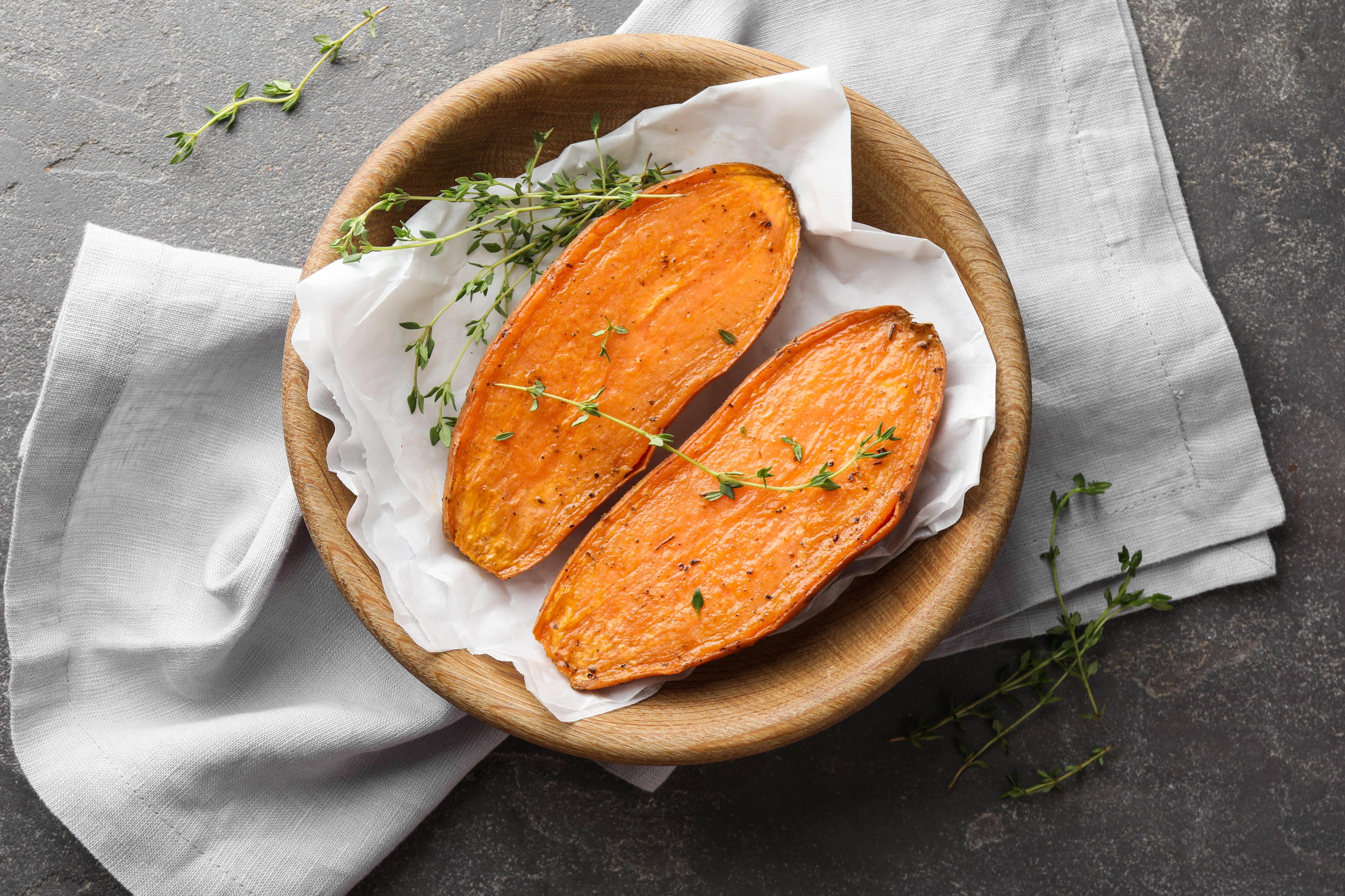 Разогрейте духовку до 200 градусов и отправьте батат выпекаться на 30-35 минут.