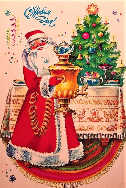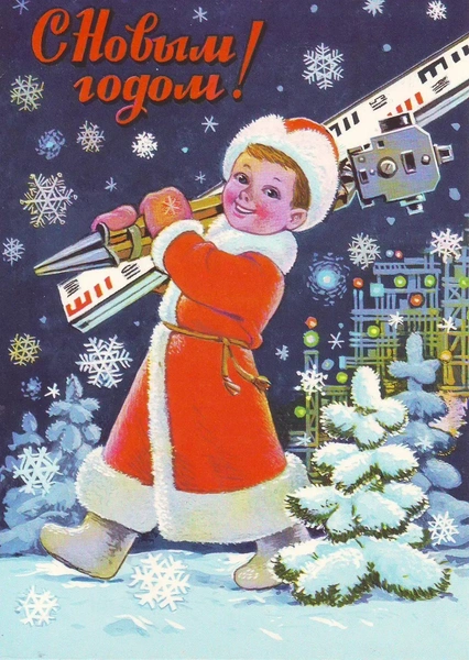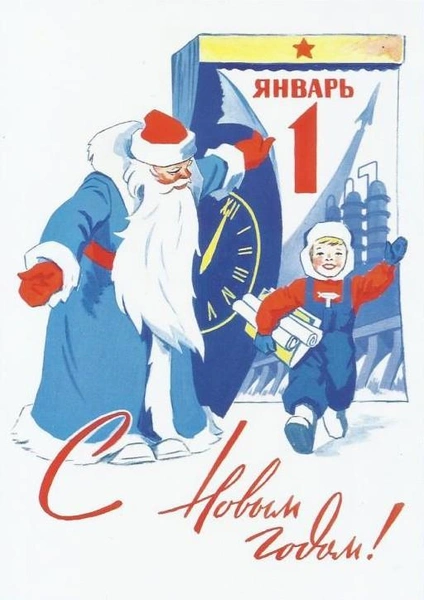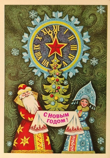 После революции производство открыток на некоторое время прекратилось, ведь стране было не до этого. Однако, к 40-м годам традиция вновь вернулась — тогда началось массовое производство новогодних открыток. Большинство из них изображали башни Кремля, Деда Мороза, Снегурочку и снеговиков, а также надпись «С Новым годом!».
