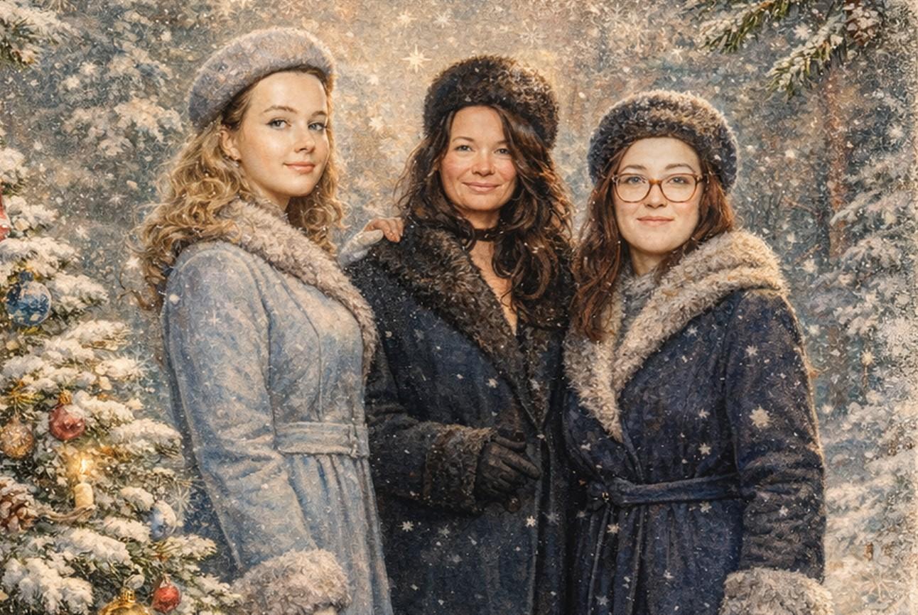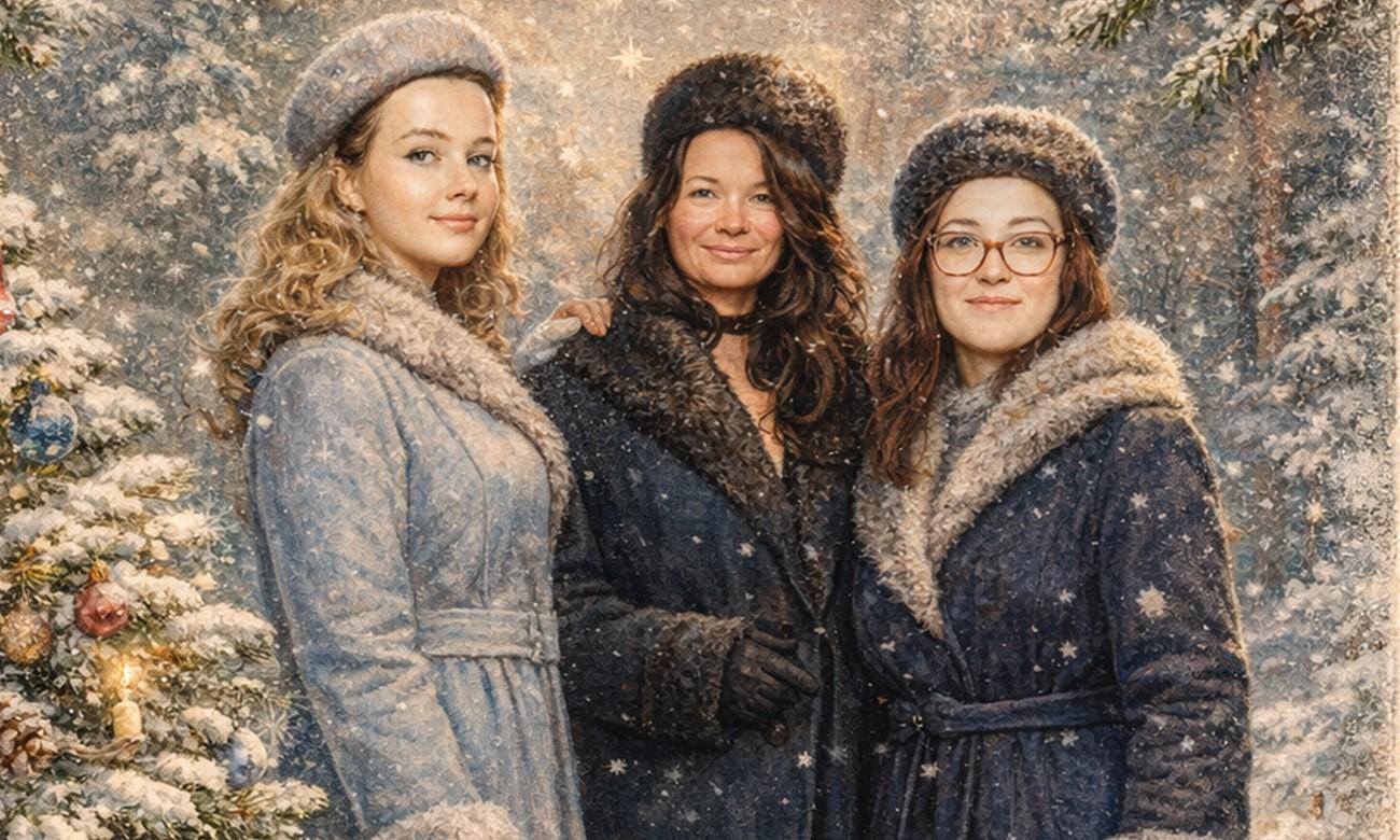 Персонажи остаются в центре композиции. Фон — зимняя сказочная атмосфера. Лица сохранить максимально похожими на оригинальную фотографию (one-to-one likeness). Без изменения черт лица, возраста и эмоций. Реалистичное сходство, аккуратная художественная стилизация без искажений.
