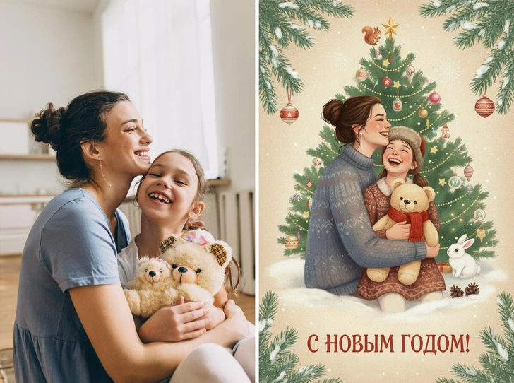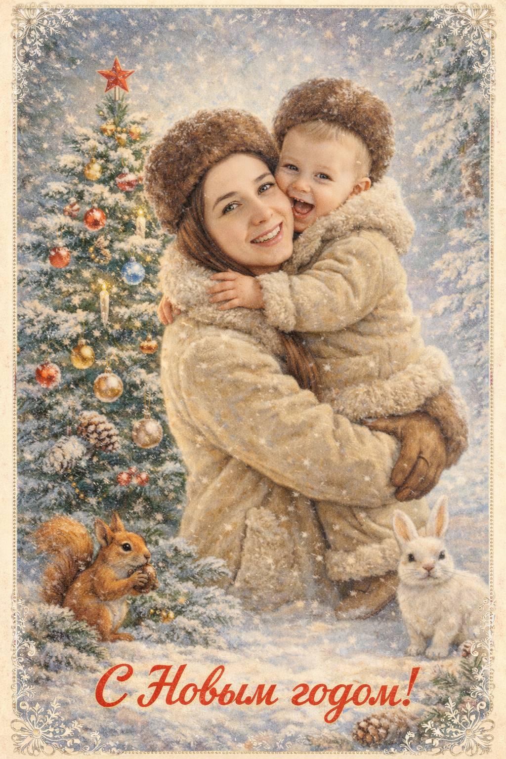 Создай винтажную новогоднюю открытку на основе загруженной фотографии. Стиль — советские сказочные открытки 1950-1970-х годов, мягкая живописная иллюстрация, ощущение тепла и уюта. Вертикальный формат 9:16.