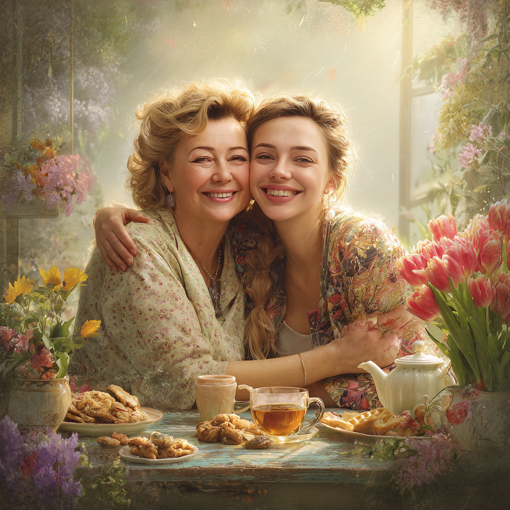 Уютная открытка в стиле фотореализма. Мама и дочь сидят за деревянным столиком в цветущем саду. На столе — чайник, чашки с чаем, вазочка с печеньем и букет тюльпанов. Женщины обнимаются и смеются. Теплый солнечный свет, легкая дымка, атмосфера домашнего уюта и счастья. Внизу элегантная подпись: «С 8 Марта, родная».