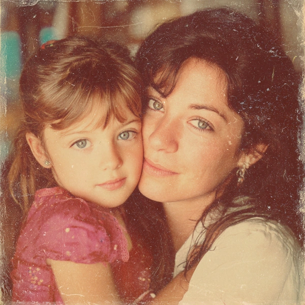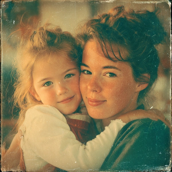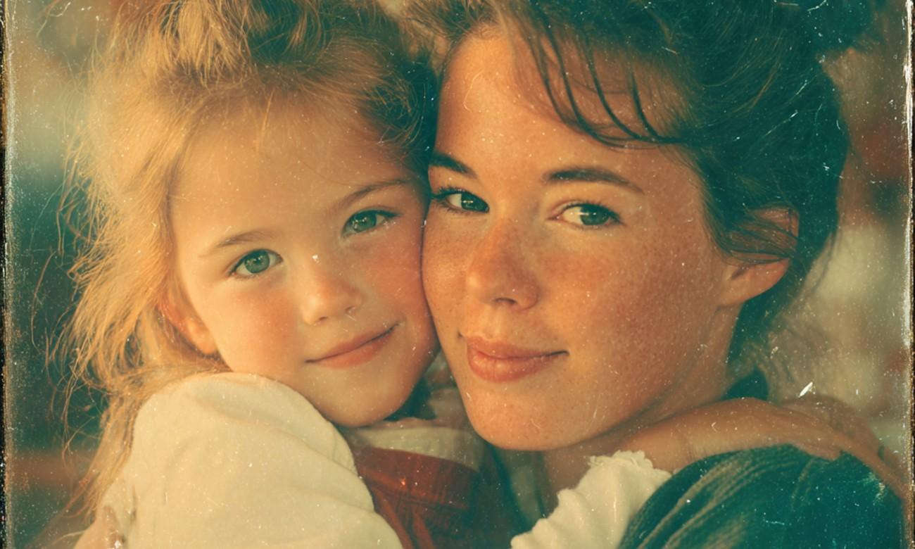 Открытка, стилизованная под старую семейную фотографию из 90-х. На фото мама с дочкой на руках. Эффект пленки, легкая зернистость, теплые тона. Вокруг размытый фон — домашний интерьер или природа. Внизу подпись красивым курсивом: «Ты всегда рядом. С праздником, мамочка».