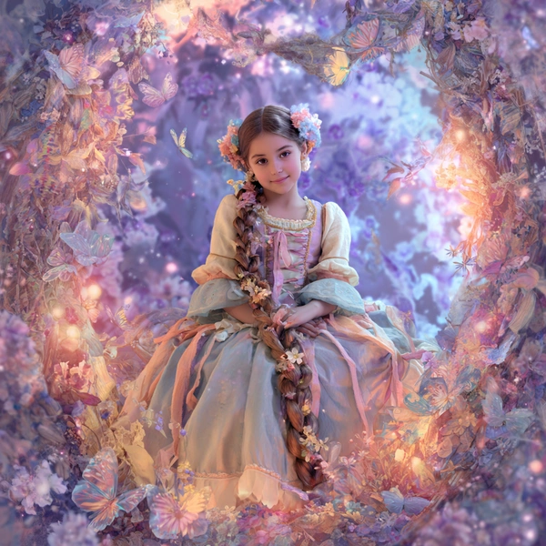Сказочная открытка в стиле диснеевской анимации. Маленькая девочка (или взрослая дочь, стилизованная под сказочного персонажа) сидит на троне из цветов или стоит в волшебном лесу. На ней красивое платье, в волосах вплетены ленты и цветы. Вокруг порхают бабочки и светятся огоньки. Стиль: анимация, яркие цвета, атмосфера чуда. Надпись: «С 8 Марта, моя принцесса».