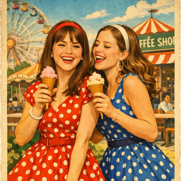 Ретро-открытка в стиле 1960-х годов. Две подруги одеты в яркие платья в горошек и балетки. Они держат в руках мороженое и смеются. Фон — парк аттракционов или старая кофейня. Цвета насыщенные, с легкой зернистостью, имитация старой фотографии. Внизу надпись винтажным шрифтом: «С праздником весны!»