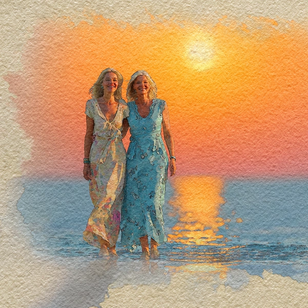Трогательная открытка в стиле нежной иллюстрации. Мама и взрослая дочь идут по полю, усыпанному ромашками и маками (или по берегу моря). Солнце садится за горизонт, золотистый свет окутывает фигуры. Обе женщины улыбаются, возможно, держатся за руки. Стиль: пастельная живопись, мягкие тени, атмосфера любви и благодарности. В уголке надпись от руки: «Спасибо, что ты у меня есть. С 8 Марта, мама».