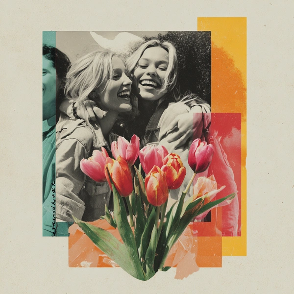 Современная открытка на 8 Марта. На переднем плане — букет тюльпанов. За цветами — силуэты женщин, они смеются и обнимаются. Стиль: коллаж, сочетание фотографии и графики, ощущение праздника. Крупная надпись: «8 Марта».
