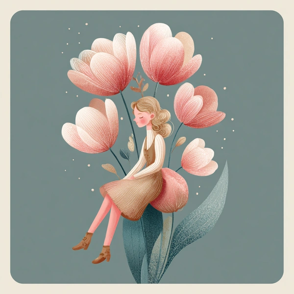 Стильная минималистичная открытка. На ней изображена девочка, которая держит в руках огромный букет тюльпанов (или сама сидит в цветке, как Дюймовочка). Стиль: плоская графика, чистые линии, пастельные тона. Минимум деталей, акцент на цветах. В углу простая надпись: «С 8 Марта, доченька».
