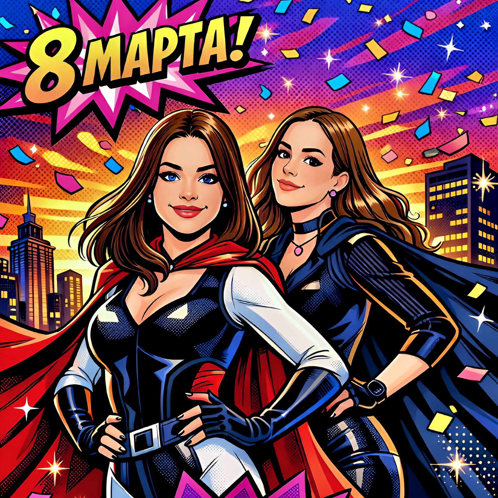 Яркая, дерзкая открытка в стиле комиксов. Две подруги изображены как супергероини. На них стильные плащи, они стоят в эффектных позах на крыше небоскреба на закате. Вокруг разлетаются конфетти и блестки. Стиль: поп-арт, сочные цвета, четкие контуры, динамика. Надпись крупно: «С 8 Марта, моя супергероиня!»