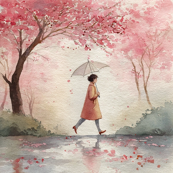 Нежная романтичная открытка в стиле акварельной иллюстрации. Девушка гуляет под прозрачным зонтиком в цветущем парке. Идет легкий весенний дождь, на земле лужи, в которых отражается небо. Настроение — легкая грусть, смешанная с надеждой и счастьем. Стиль: нежные размытые краски, воздушность. Подпись: «С праздником весны, моя прекрасная дочка».
