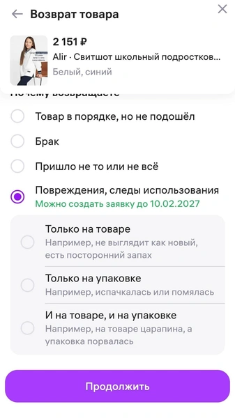 Нажимаете на кнопку «Вернуть». Выбираете пункт «Брак», либо «Повреждения, следы использования».