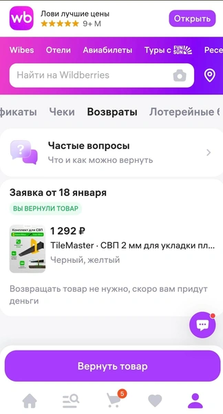 В приложении или браузерной версии Wildberries зайдите в раздел «Возвраты».