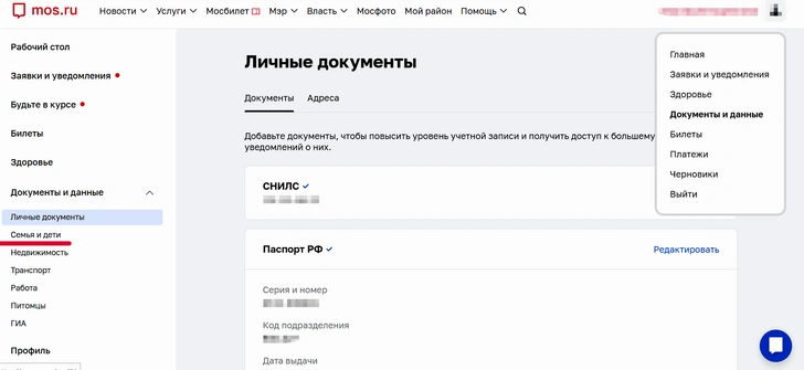 Точно так же, как и с Госуслугами, если ваш ребенок прикреплен к московской поликлинике, вам нужно верифицировать на портале свой аккаунт и добавить данные о ребенке в разделе Профиль — Документы и данные — Семья и дети. Введите все данные ребенка (свидетельство о рождении, СНИЛС, медицинский полис), дождитесь подтверждения данных — на это может уйти несколько минут или несколько дней.