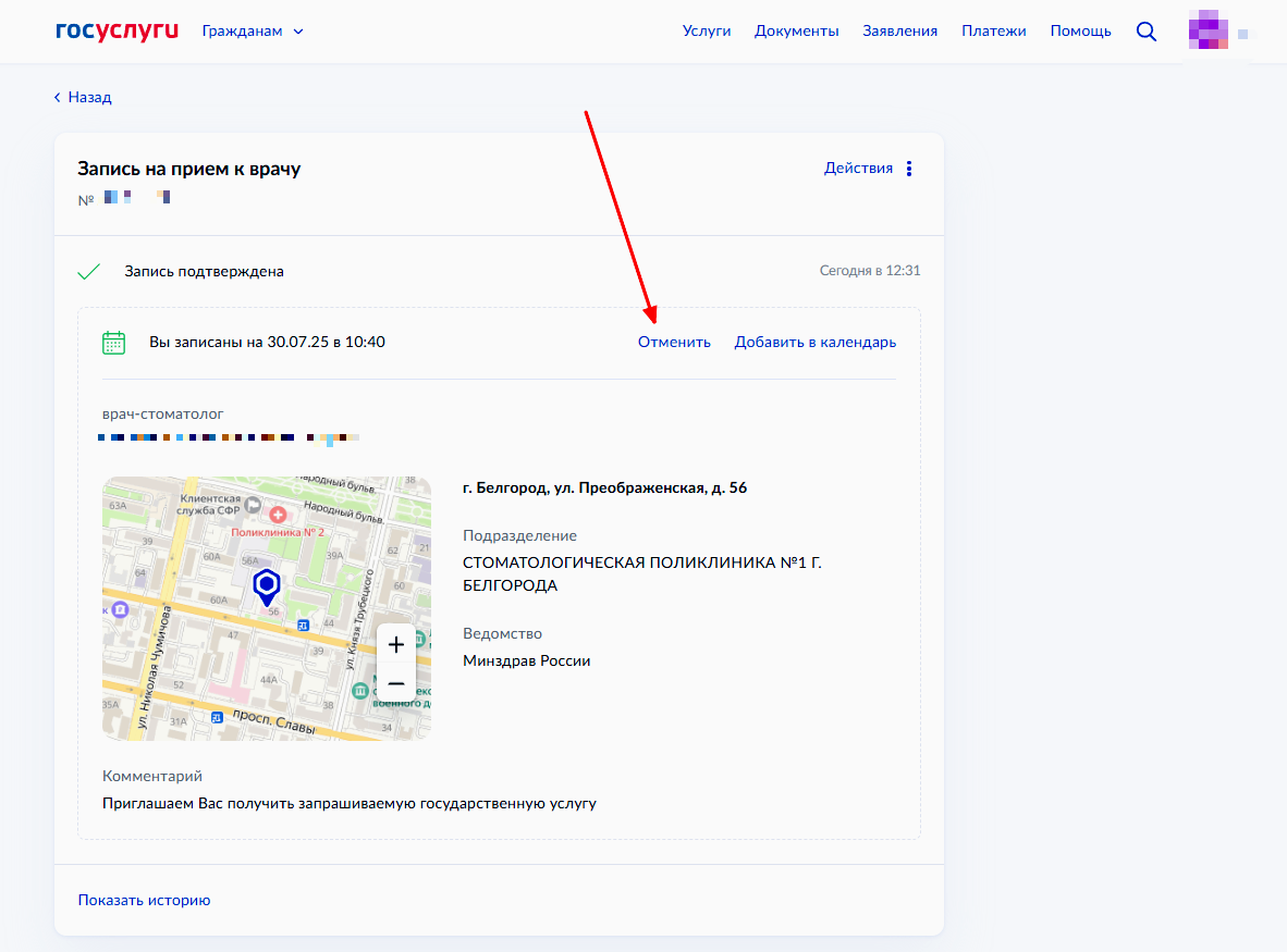 Выбрать вкладку Услуги — Здоровье — Запись на прием к врачу, отмена и перенос записи.