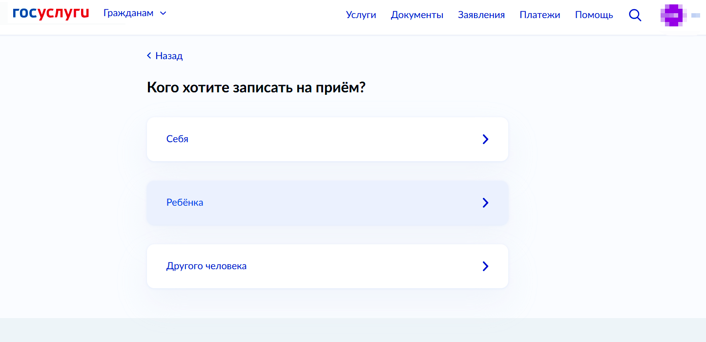 Вверху, где указана ваша фамилия, выбрать, кого записать — себя или ребенка.
