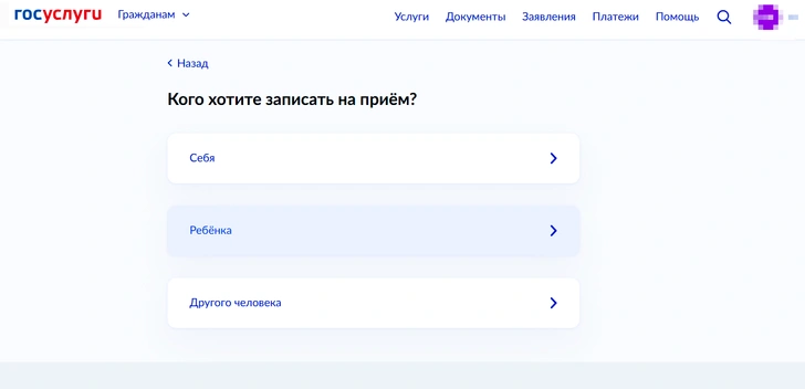 Выбрать из списка, кого записать — себя или ребенка.
