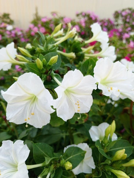 Цветки этого многолетнего кустарникового растения напоминают петуньи. В народе их называют «ночные красавицы», так как днем цветки закрываются в бутоны, а распускаются вечером и пахнут как фиалки. Окрас цветков — розовый, белый, красный, желтый и пестрый. Цветут долго — с июля по сентябрь. Мирабилис любит тень и хорошо удобренную почву.