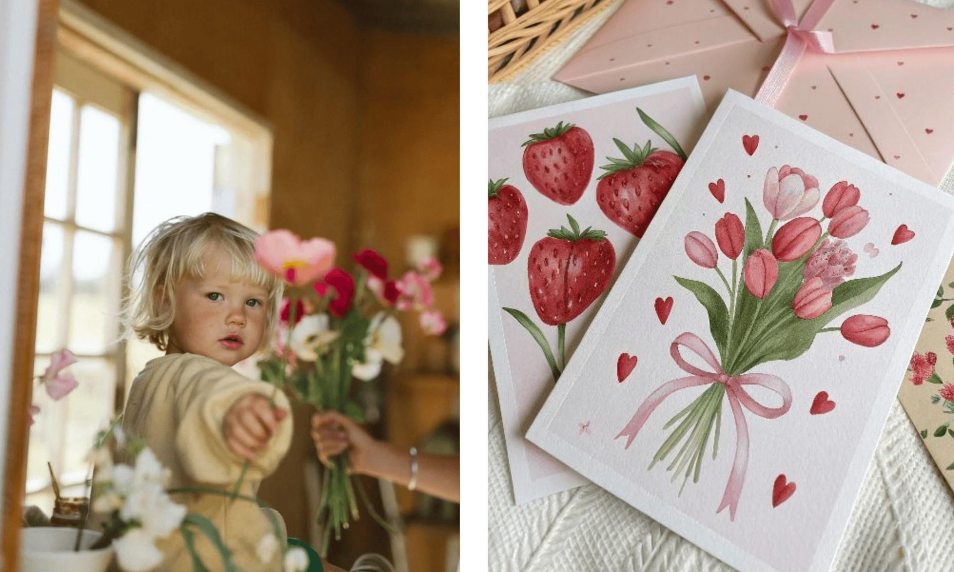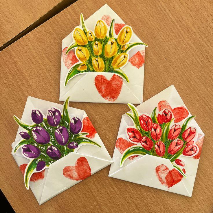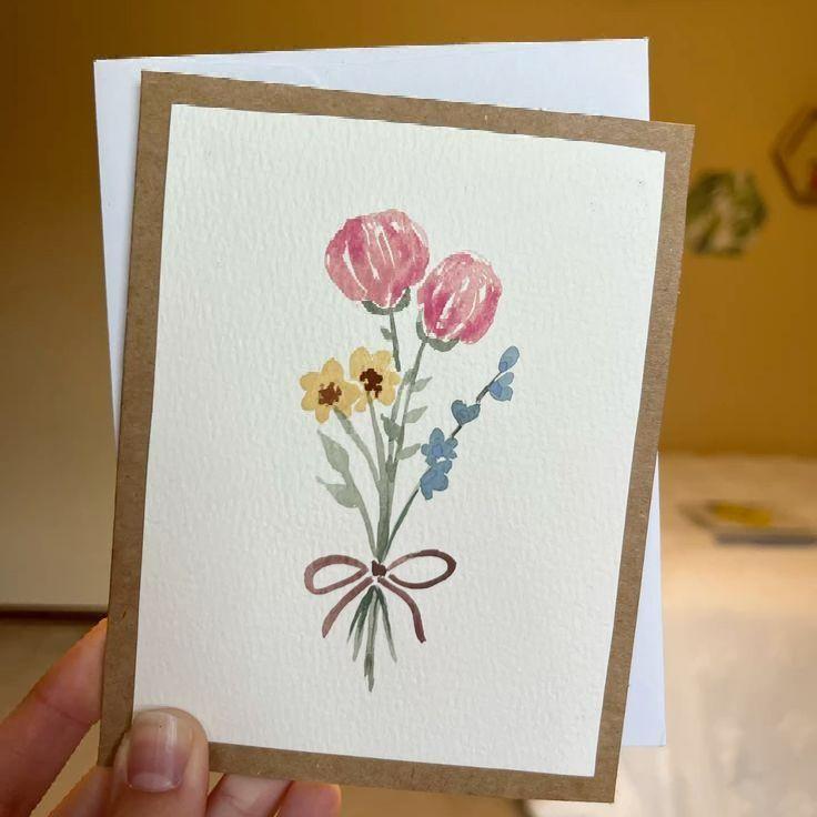 Еще один вариант цветочных открыток, но на этот раз нарисованный. В зависимости от возраста ребенка можно использовать разные способы рисования — например, если речь идет о дошкольнике, обратите внимание на пальчиковые краски, а если о пятиклашке, то в ход может пойти сложная акварель или акрил.