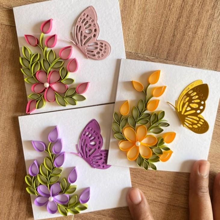 Один из самых простых, но при этом красивых и необычных вариантов открыток можно сделать в технике «квиллинг». Для этого понадобятся тонко нарезанные листы бумаги (можно купить готовый набор или порезать самим). Их необходимо будет свернуть и приклеить на основу — таким образом можно сделать цветы и другие объемные фигуры. А если покрыть сверху лаком, такая открытка проживет очень долго.
