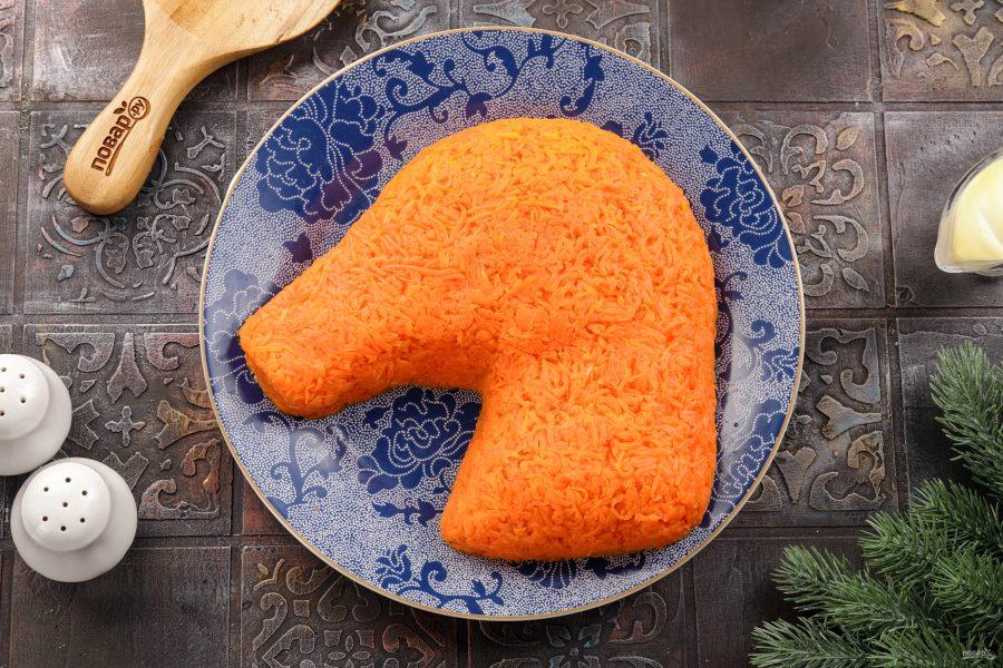 Яйца почистите и натрите на крупной терке. Морковь натрите на мелкой терке, оставляя два крупных кружочка (для ушей нашей лошади). Все натертые на терке ингредиенты не смешивайте!