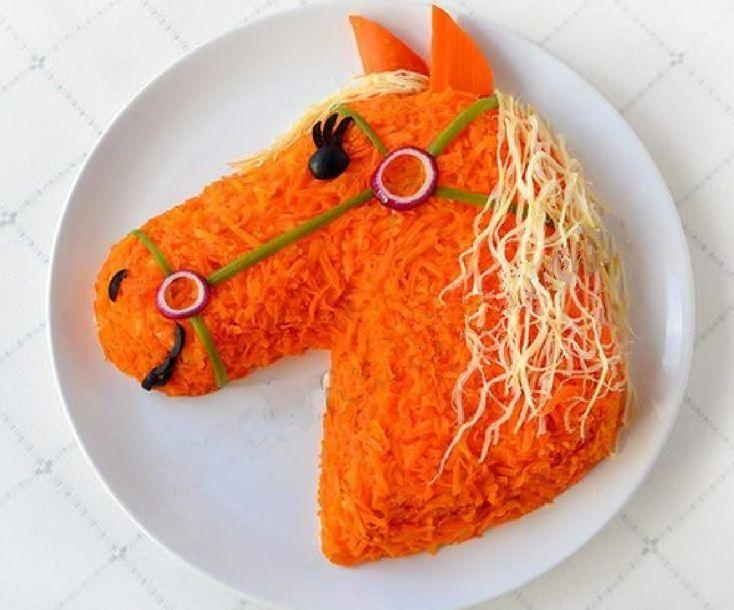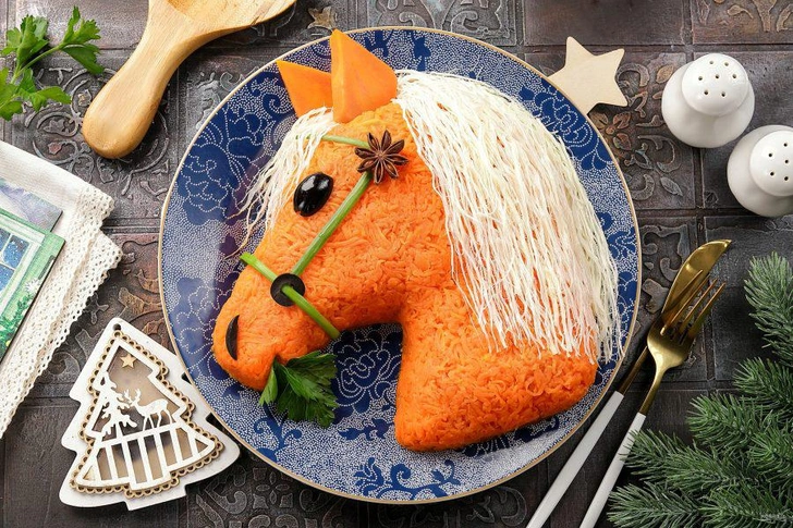 Это сытное мясное блюдо, которое можно использовать как основное. Но главное здесь — не только сочетание продуктов и вкус, но и оформление в виде лошади. Приготовить такой салат несложно, экзотические продукты вам для этого не понадобятся, а выглядеть будет очень эффектно.