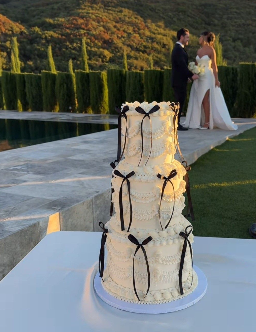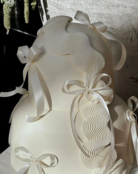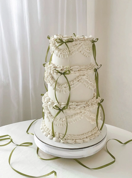 Сюда же можно отнести и торты с бантами. Они могут быть любых форм и размеров — главный акцент остается на атласной ленточке, которую лучше всего использовать в контрастном цвете. Например, если сам торт белый, подойдут черные или, например, оливковые бантики.
