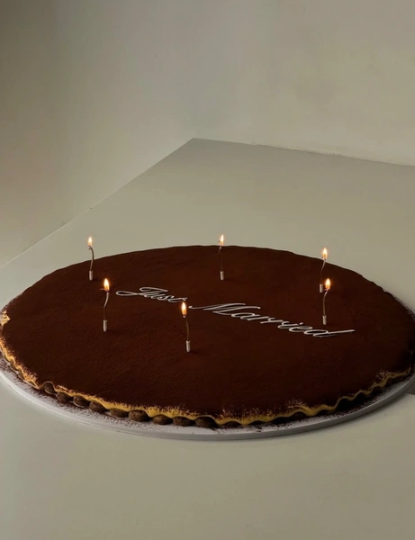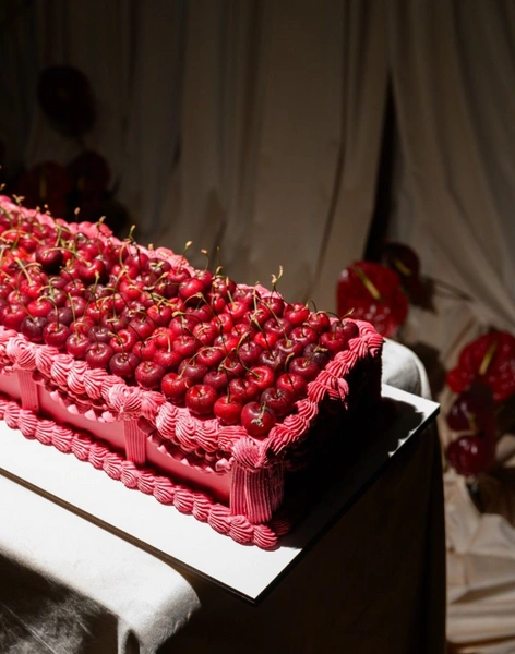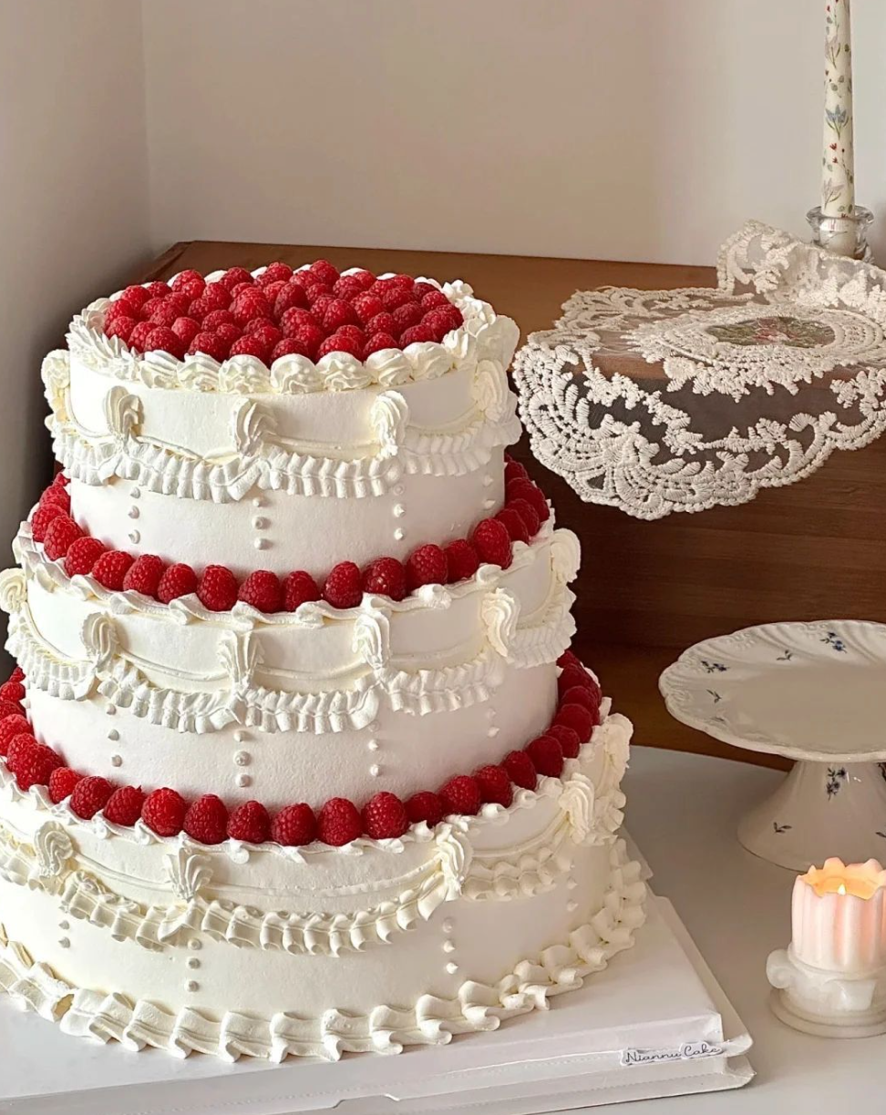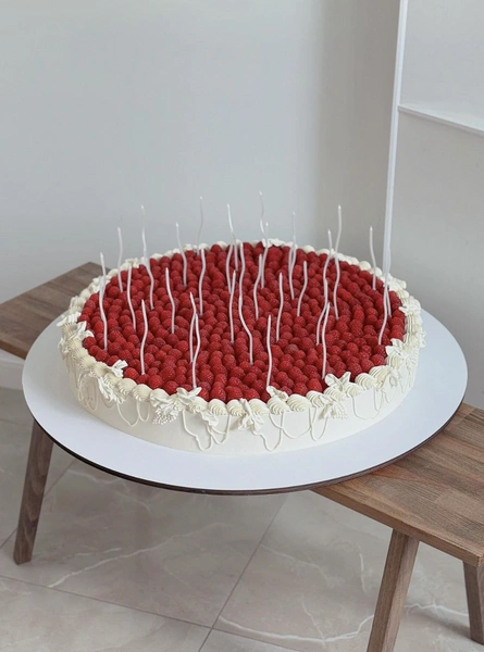 Минималистичные одноярусные торты — один из главных свадебных трендов 2025-2026. Они могут быть длинными прямоугольными или гигантскими круглыми. Чаще всего такой десерт украшают свежими ягодами (особенно эффектно смотрится крупная малина), рюшами из крема, надписями или цветами. Но даже при достаточно ярком декоре акцент останется на масштабе торта.