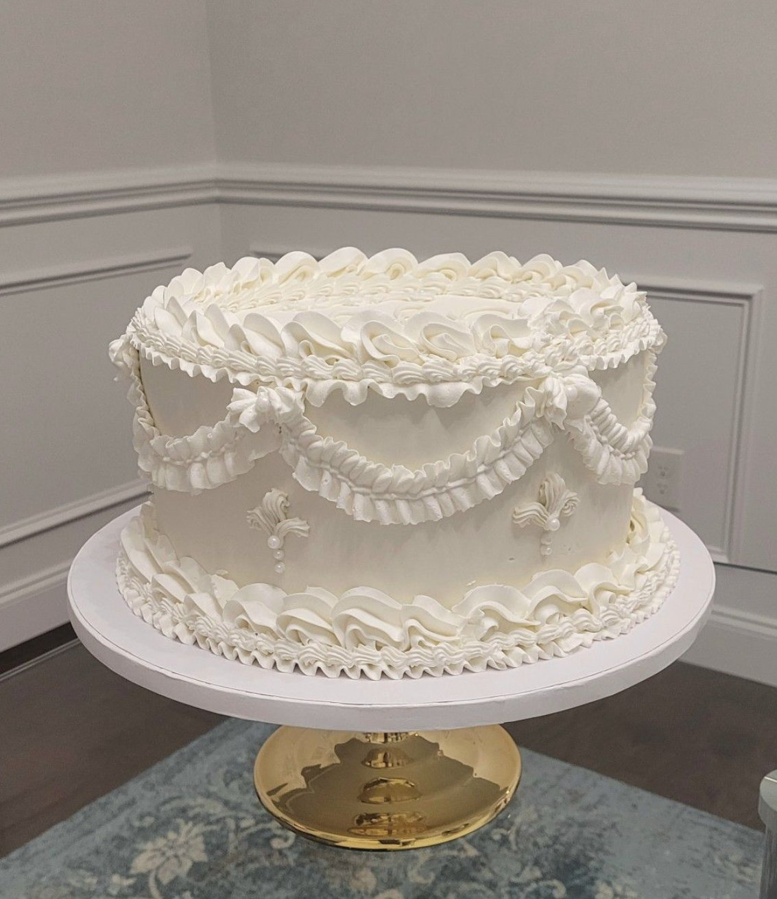 Еще один актуальный вариант декора — торты в стиле винтаж или, как его еще называют, Lambeth. Выглядят такие десерты, как настоящее произведение искусства эпохи рококо. Цветы, ракушки, кремовые оборки, рюши и взбитые пики — более праздничное украшение придумать сложно.