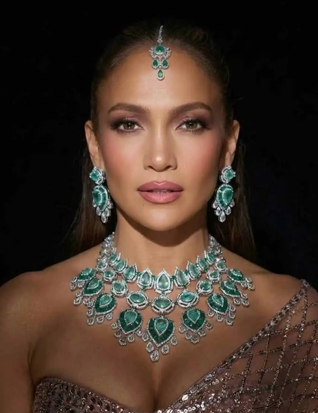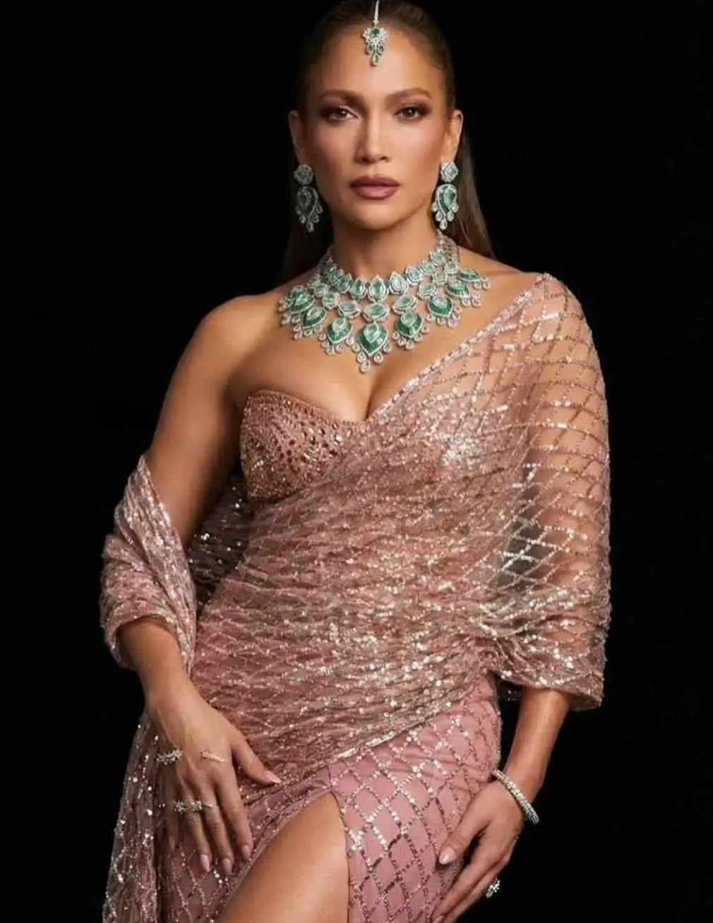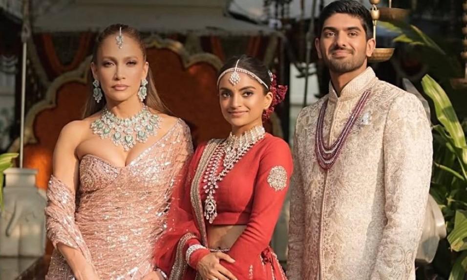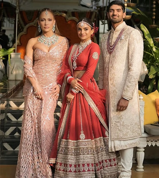 На свадьбе бывшая супруга Бена Аффлека выглядела безупречно в нежно-розовом национальном костюме — сари. Образ был сшит на заказ индийским модельером и кутюрье Манишем Малхотрой и украшен кристаллами Swarovski. Ярким акцентом стало потрясающее ожерелье из изумрудов и бриллиантов. К нему также шли серьги и традиционное индийское украшение для головы — тика.
