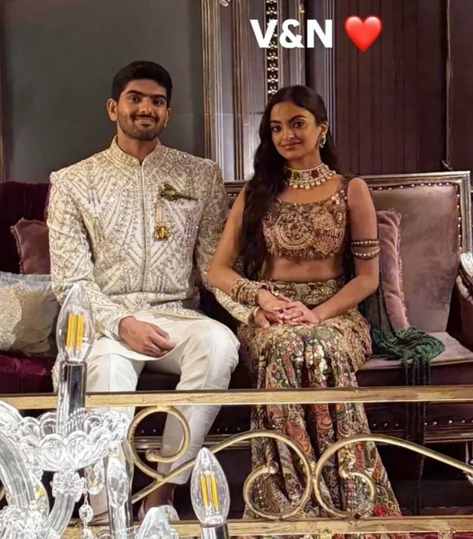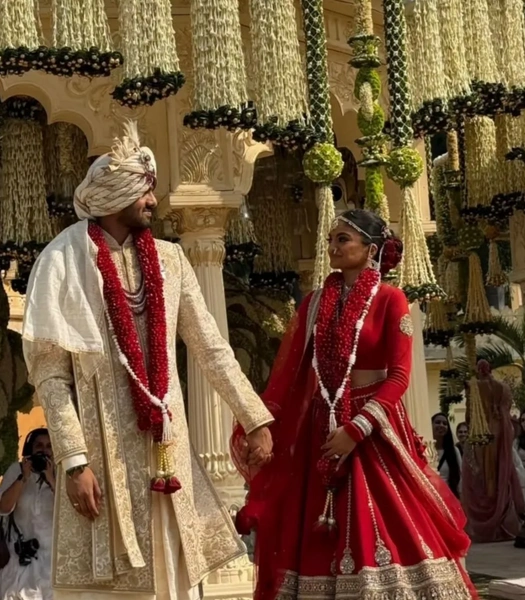 Что же касается невесты и жениха, то они сменили несколько образов. Так для основной части церемонии Нетра выбрала пышное алое платье, богато расшитое золотистым кружевом и драгоценными камнями, а ее избранник предпочел комбинацию из длинного сюртука, так называемого шервани, свободных брюк и тюрбана — дастара.