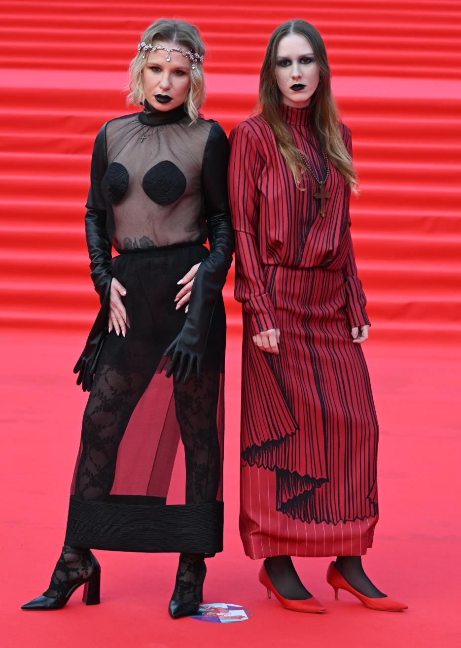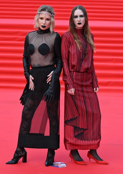 Для выхода в свет мама и дочь выбрали дерзкие образы. На дорожке Валерия появилась в полностью прозрачном черном платье с кожаными рукавами и круглыми вставками на груди. Его режиссер дополнила ажурными колготками в тон и диадемой из белого золота. Октавия остановилась на более сдержанном варианте. Она надела закрытое красное платье в черную полоску, но разбавила его бусами с массивным крестом. Обе сделали одинаковый готический макияж — с обесцвеченными бровями и черной помадой.