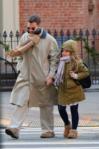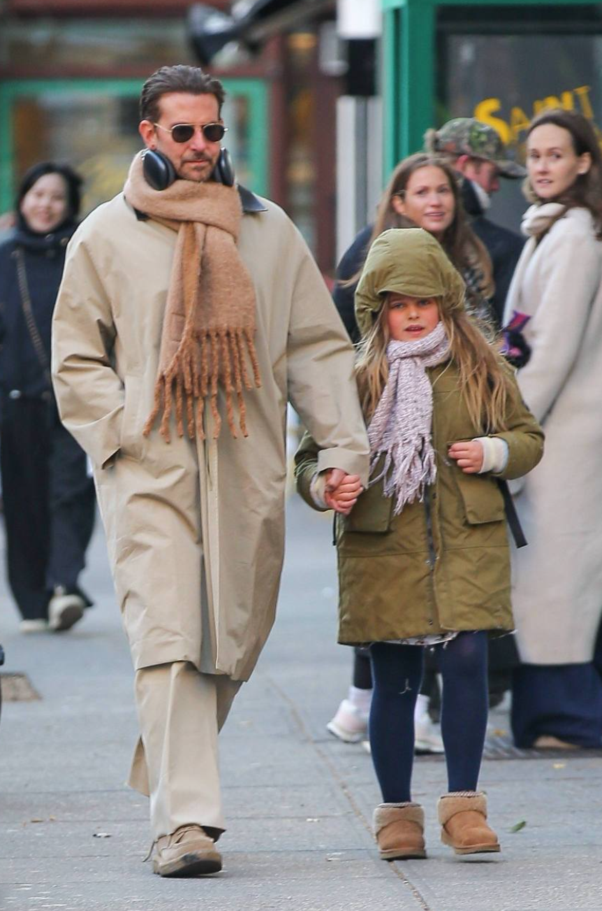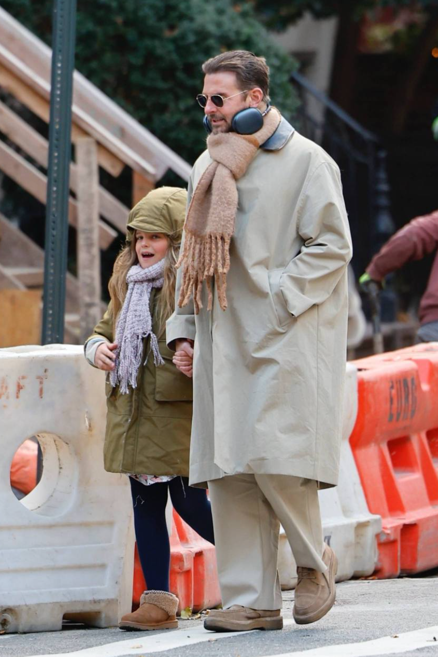 На очередной встрече с наследницей звезда фильма «Области тьмы» вновь попал в объективы фотографов. В этот раз Купер выбрал образ в единой цветовой гамме — он надел классический бежевый макинтош и базовые брюки, которые сочетал с замшевыми ботинками и шерстяным шарфом более темного песочного оттенка. С собой актер также взял массивные наушники, в которых, вероятно, слушал музыку по дороге в город.