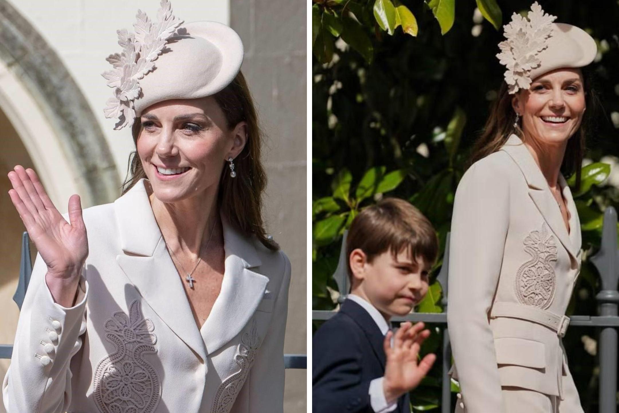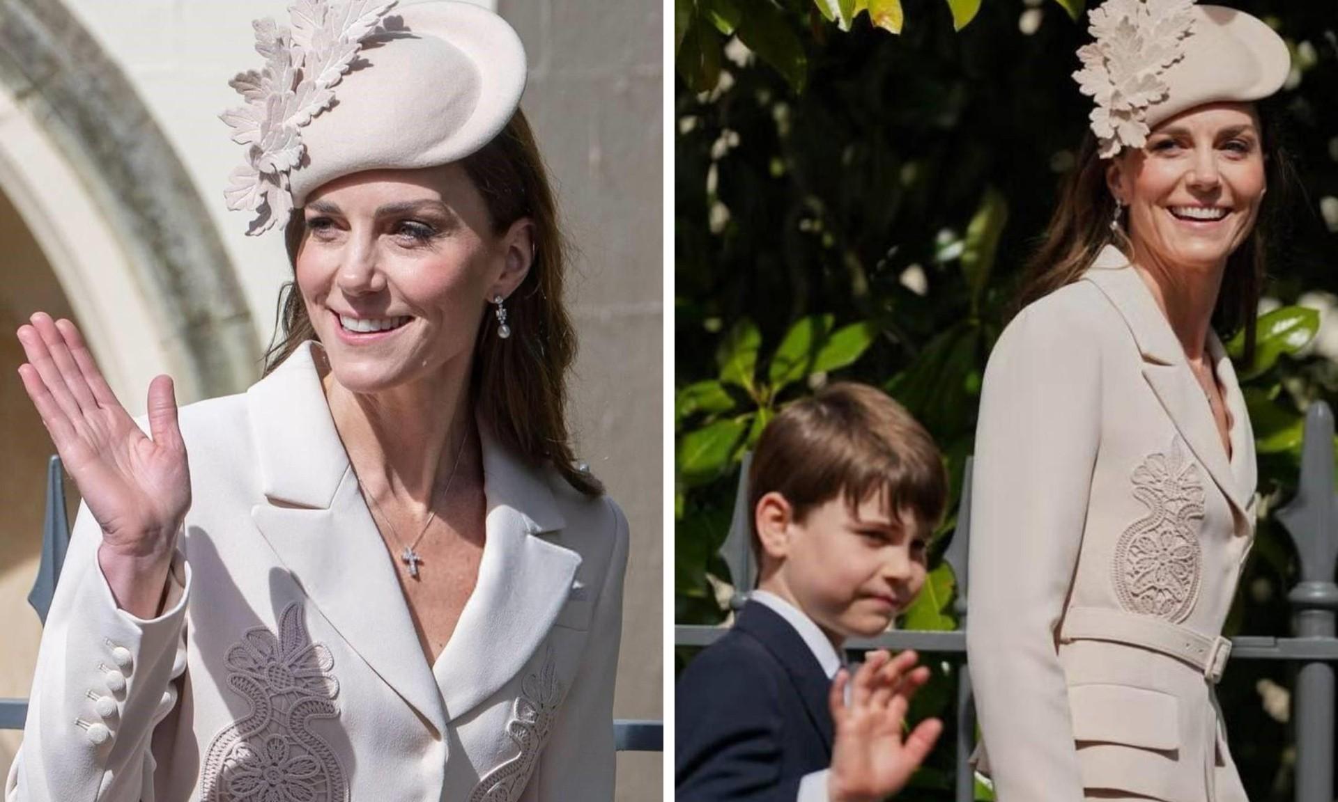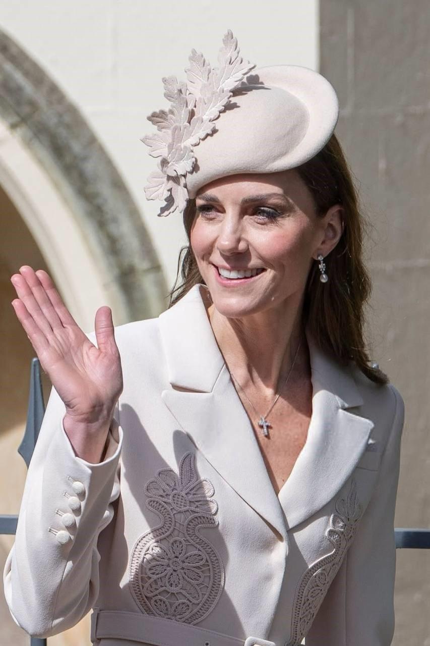 Кейт была одета в костюм своего любимого бренда Self-Portrait цвета экрю. В двойке из длинной юбки и приталенного жакета с поясом и вышивкой Кэтрин уже появлялась. В этот раз принцесса дополнила ансамбль шляпкой с дубовыми листьями.