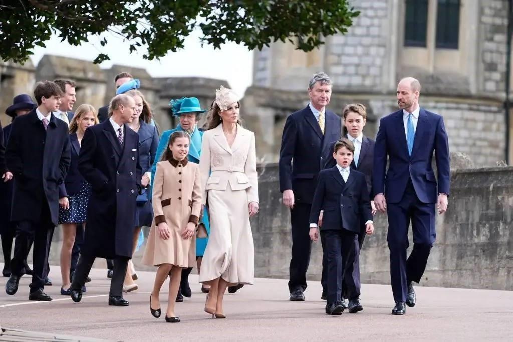 Старшие члены королевской семьи, принц и принцесса Уэльские и их дети, шли пешком от Виндзорского замка, несмотря на ветреную погоду. Большая и, что примечательно, молодая компания весело беседовала во время прогулки.