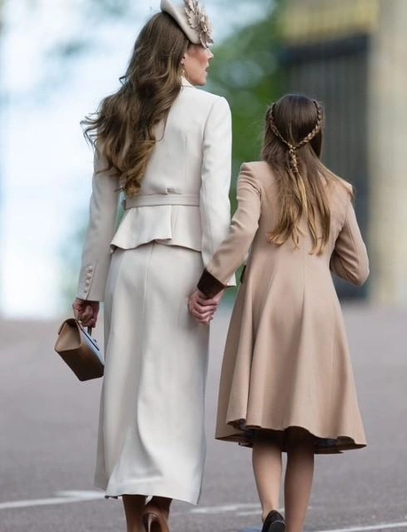Принцесса Шарлотта была в этот день в элегантном бежевом пальто с бархатным воротником, манжетами и пуговицами и в черных Мэри Джейн. Прическа принцессы в этот день была из двух косичек, соединенных на затылке в одну. Шарлотта радостно махала присутствующим, пока ее мама шла рядом. Многие отметили, как дочь Уильяма и Кейт стала похожа на свою бабушку, королеву Елизавету.