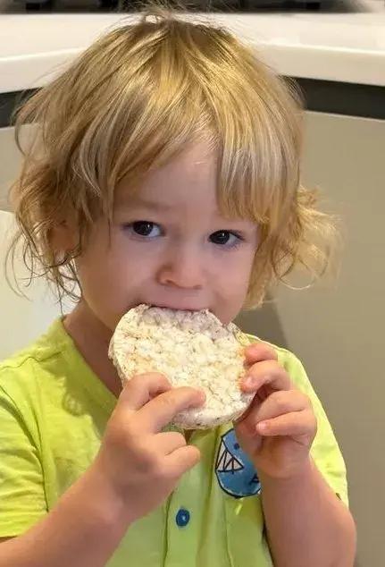 На фотографии можно увидеть очаровательного белокурого малыша, который ест хлебец. Мальчик одет в ярко-желтую футболку с нарисованной рыбкой. Ребенок смотрит прямо в камеру и выглядит очень сосредоточенным.