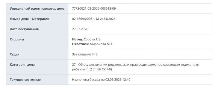 Судя по информации в картотеке судов, Андрей Сорока трижды обращался с иском к Мироновой в Пресненский суд Москвы. Сначала актер просил об «устранении препятствий к общению с ребенком его близких родственников» (вероятно, имеются в виду его родители), но Андрею отказали из-за ошибок в заявлении. После этого Сорока снова подал на актрису в суд, заявив, что она препятствует его общению с наследником. Этот иск суд принял — заседание по нему назначено на 2 июня.