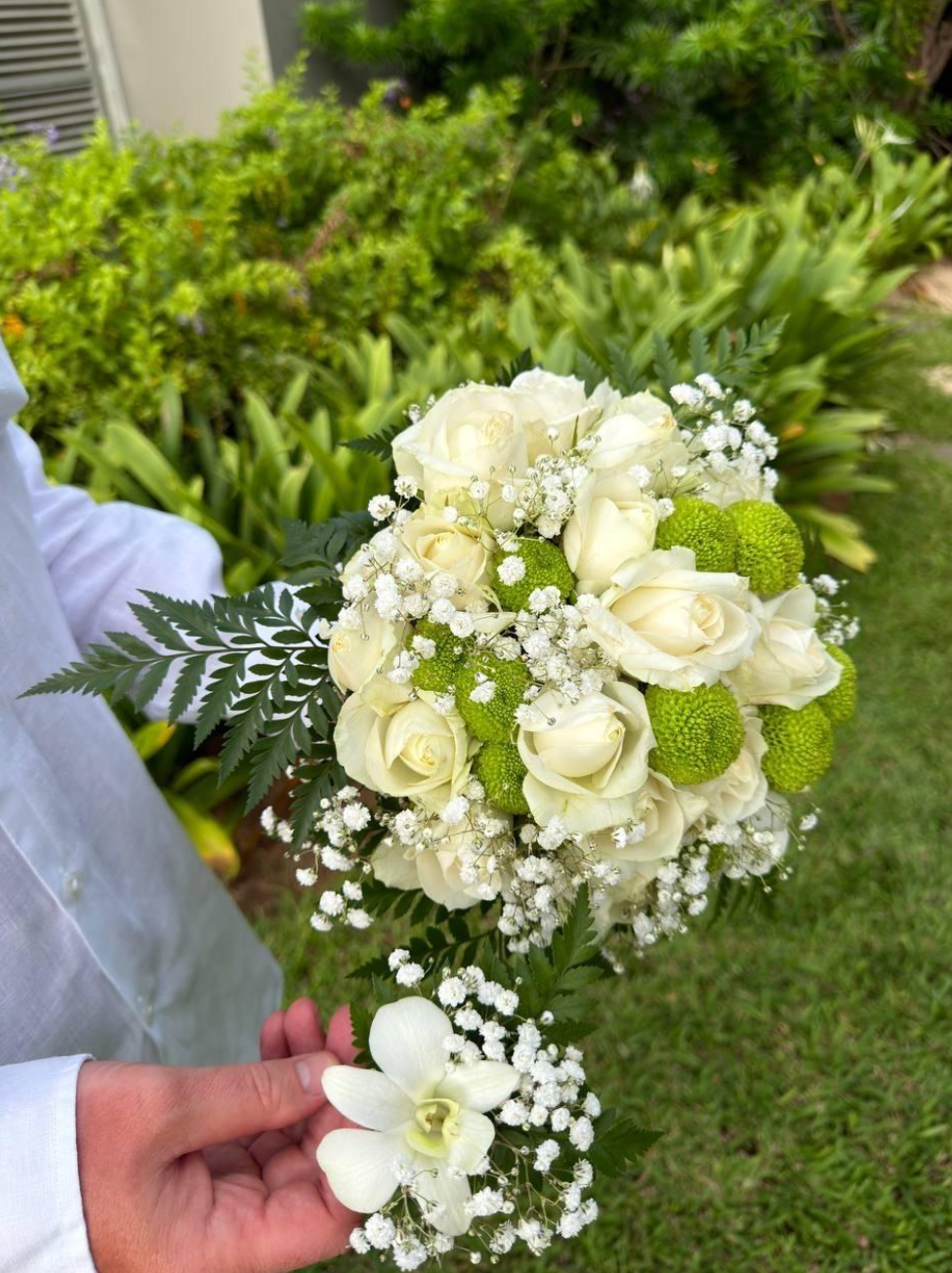 В этот особенный для пары праздник Мария выглядела не менее элегантно, чем в день свадьбы. Многодетная мать надела кремовое платье-комбинацию, которое подчеркнуло ее стройную фигуру, а также сделала аккуратную прическу. Завершило образ объемное колье, а в руках Мария несла роскошный букет из белых роз, зеленых хризантем и гипсофилов.