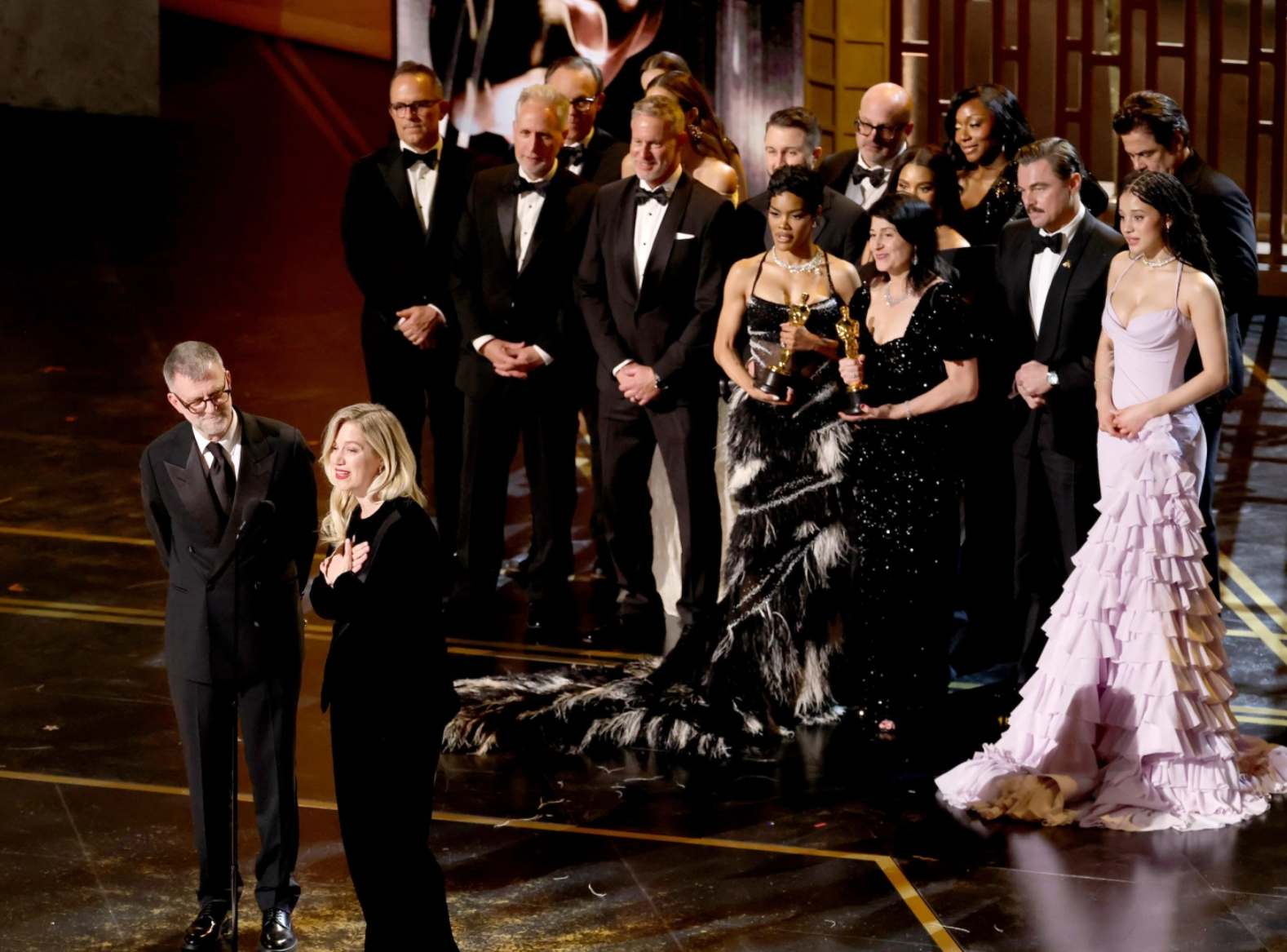 Еще одним ярким моментом церемонии стал дуэт Энн Хэтэуэй и Анны Винтур. Вместе они объявляли победителей в номинациях «Лучший дизайн костюмов» и «Лучший макияж и прическа». Обе статуэтки получил фильм «Франкенштейн».