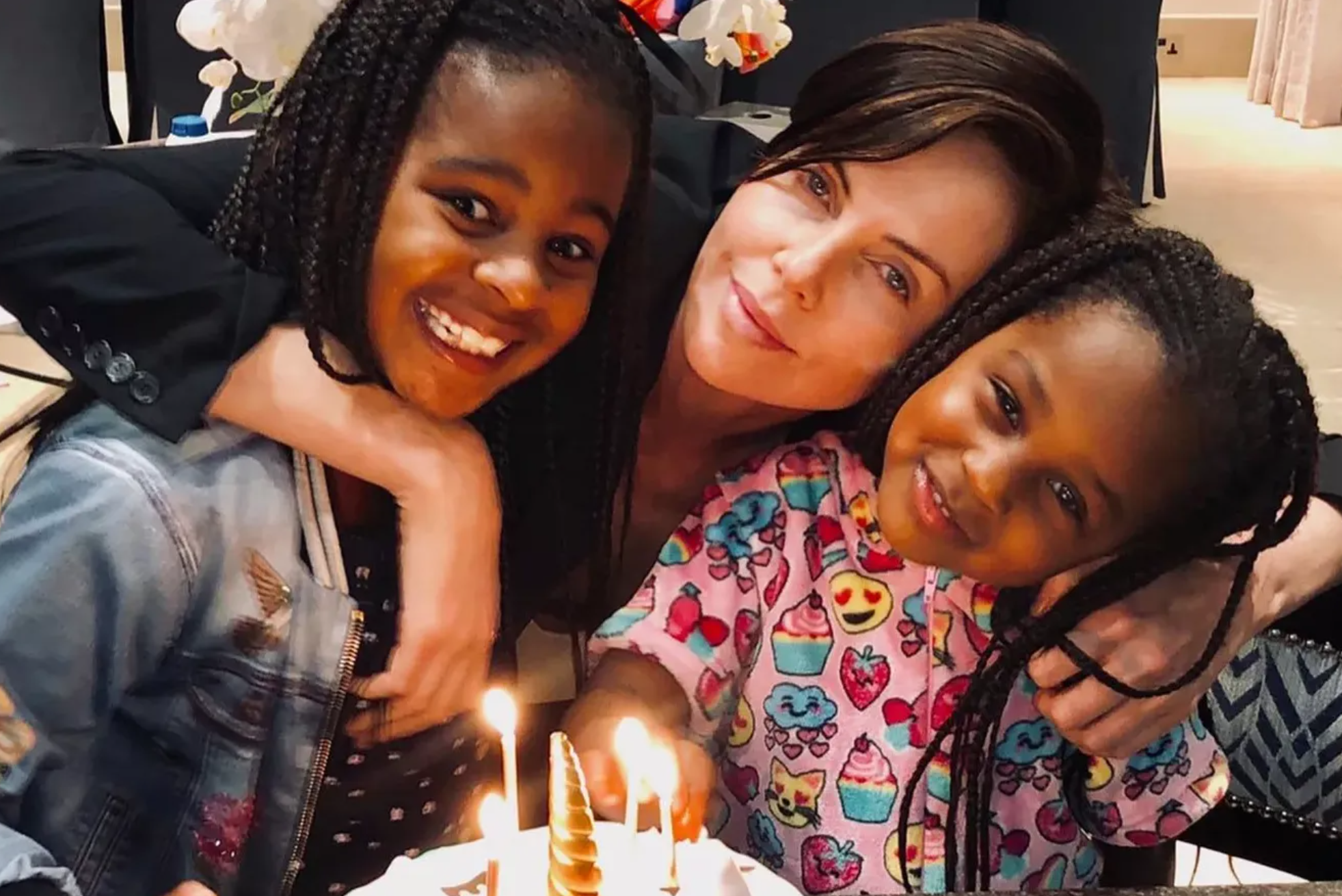 В настоящее время голливудская звезда воспитывает двоих приемных детей: сына Джексона и дочь Августу. Семья живет в Лос-Анджелесе. По словам Шарлиз, появление детей позволило ей взглянуть на мир по-другому. «Когда думаешь об этом, осознаешь реальную силу в той невинности, которой они обладают и которую мы теряем с возрастом. Поэтому здорово, что они у меня есть», — говорила она.