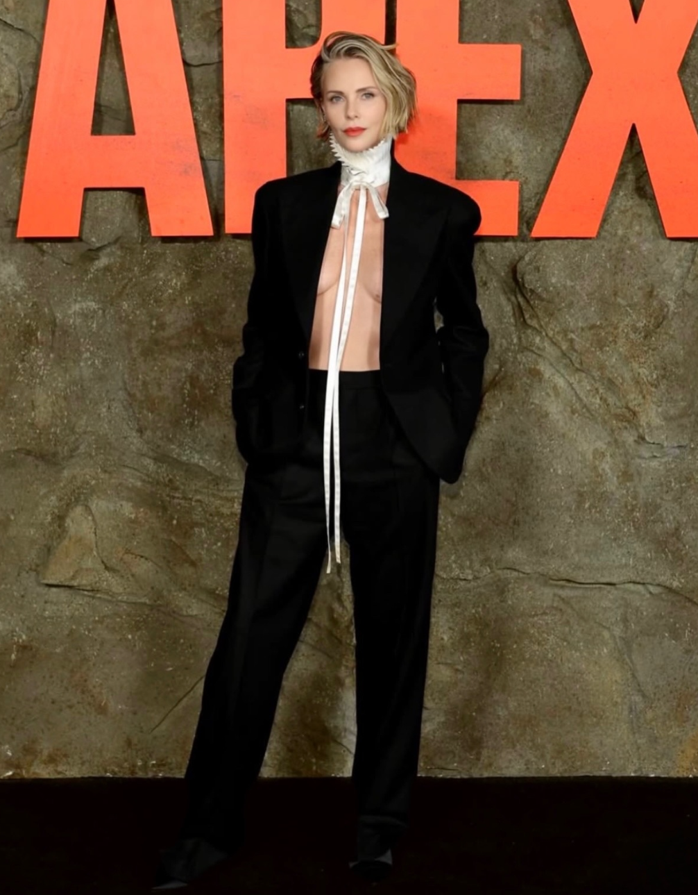 На дорожке Терон позировала в элегантном, строгом и слегка откровенном образе бренда Dior. Актриса надела классический черный пиджак на голое тело и брюки в тон. Аутфит дополнили каблуки, украшения Dior Fine Jewelry, белый плиссированный воротник с эффектными завязками и яркий макияж с акцентом на красной помаде — секретном женском «оружии», которое любой образ делает роскошнее.